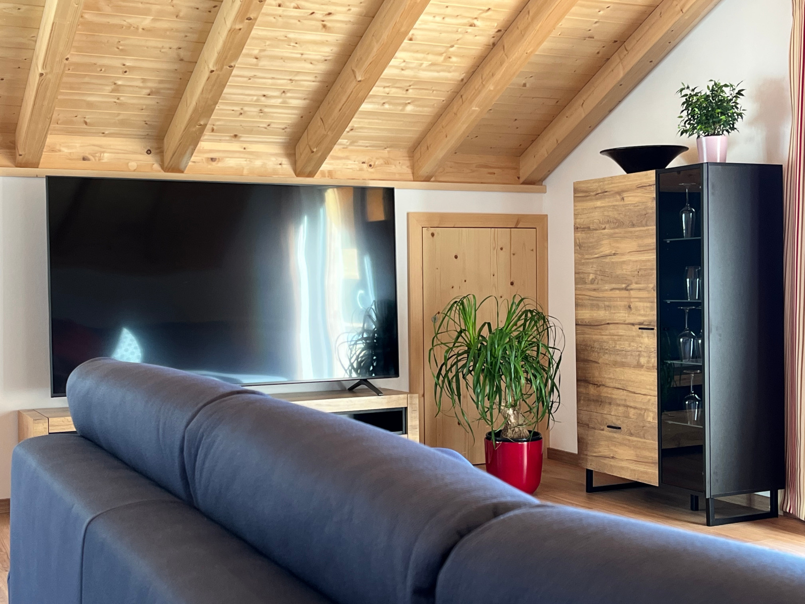 Der Wohnbereich bietet neben der exklusiven Wohnlandschaft einen 75-Zoll-Bildschirm, der Kinofeeling aufkommen lässt.